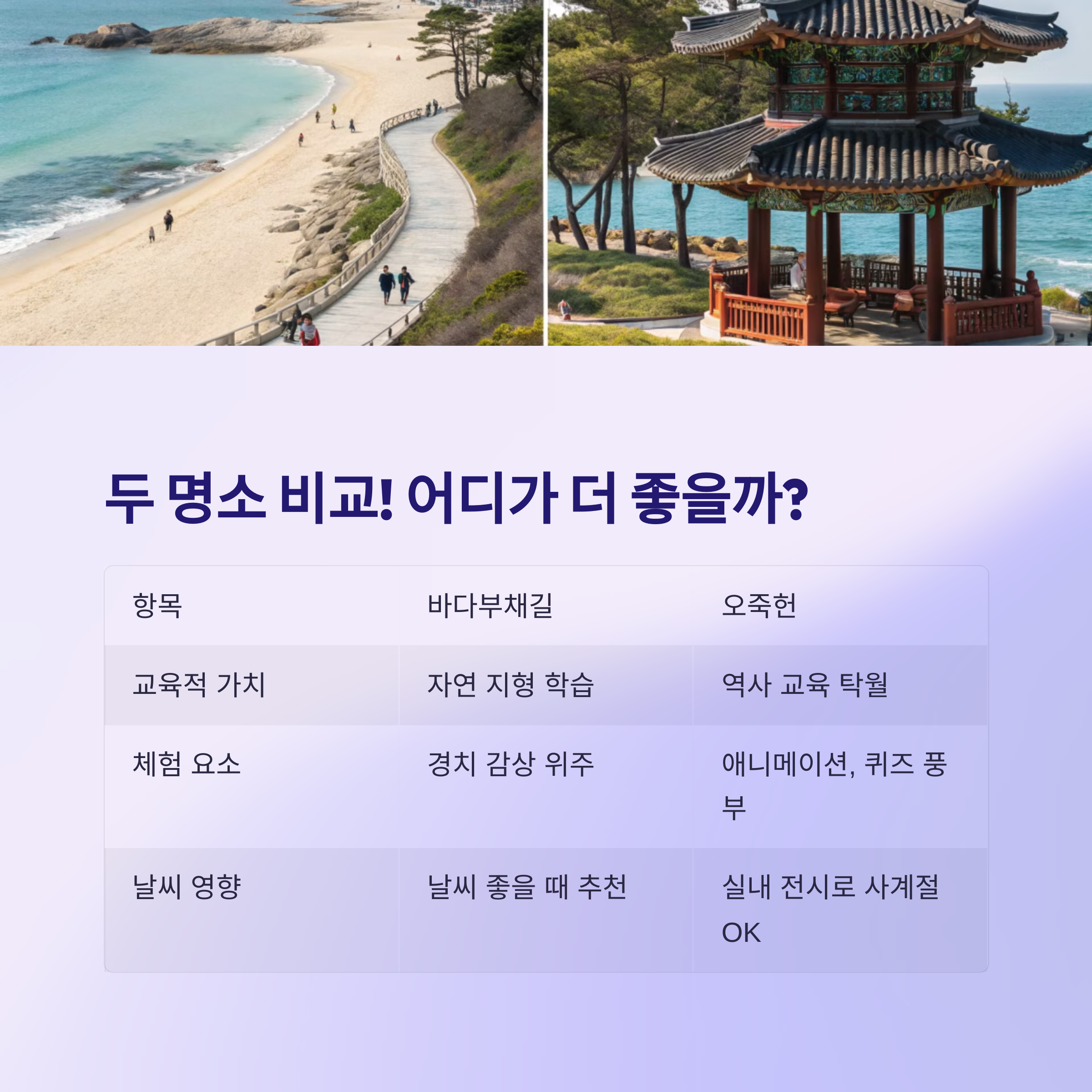 바다부채길과 오죽헌, 두 곳 모두 매력적이지만 목적에 따라 선택이 달라질 수 있어요.