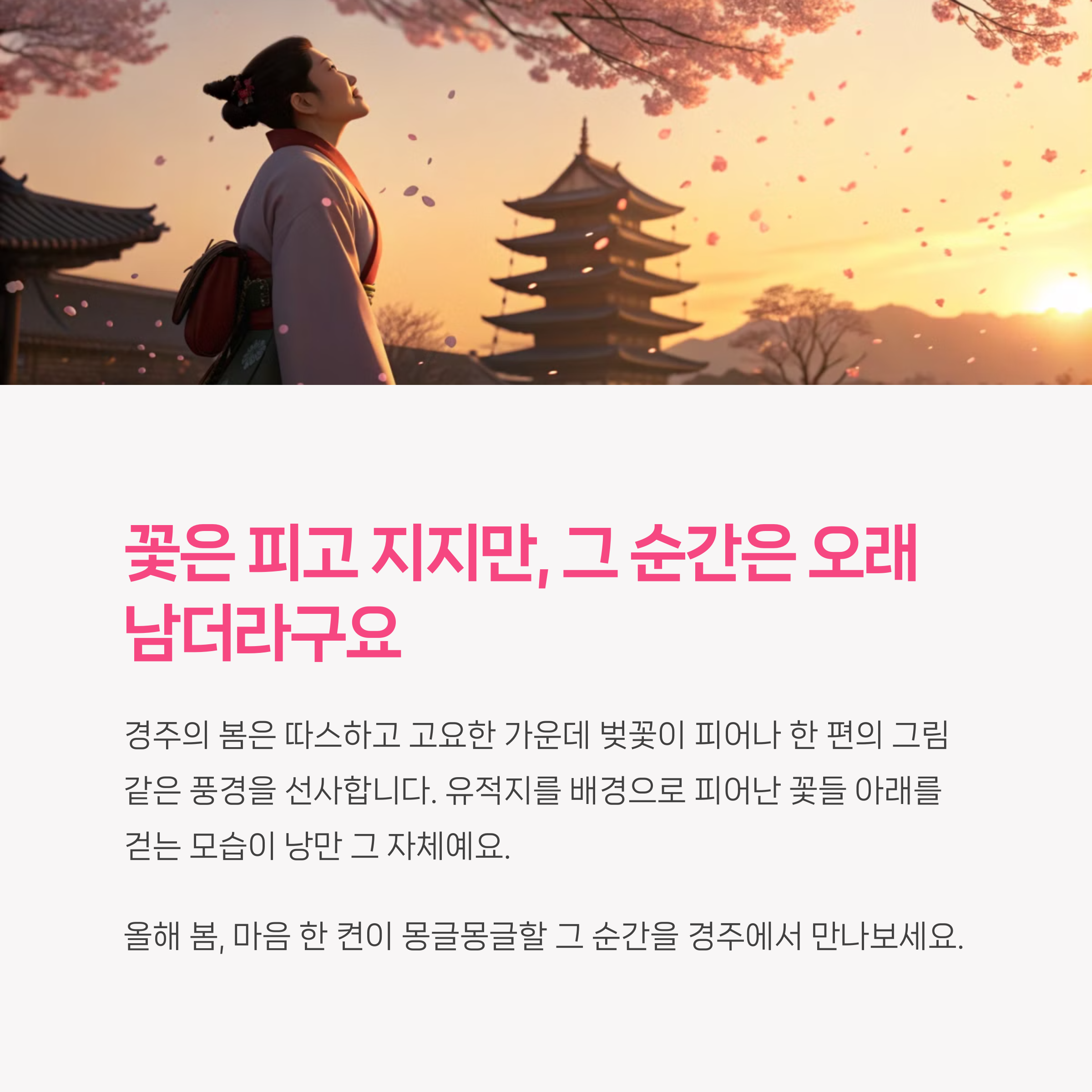 저는 매년 봄마다 ‘이번엔 어디서 꽃구경할까?’ 고민하다가 결국 또 경주로 발길을 돌리게 되더라구요.