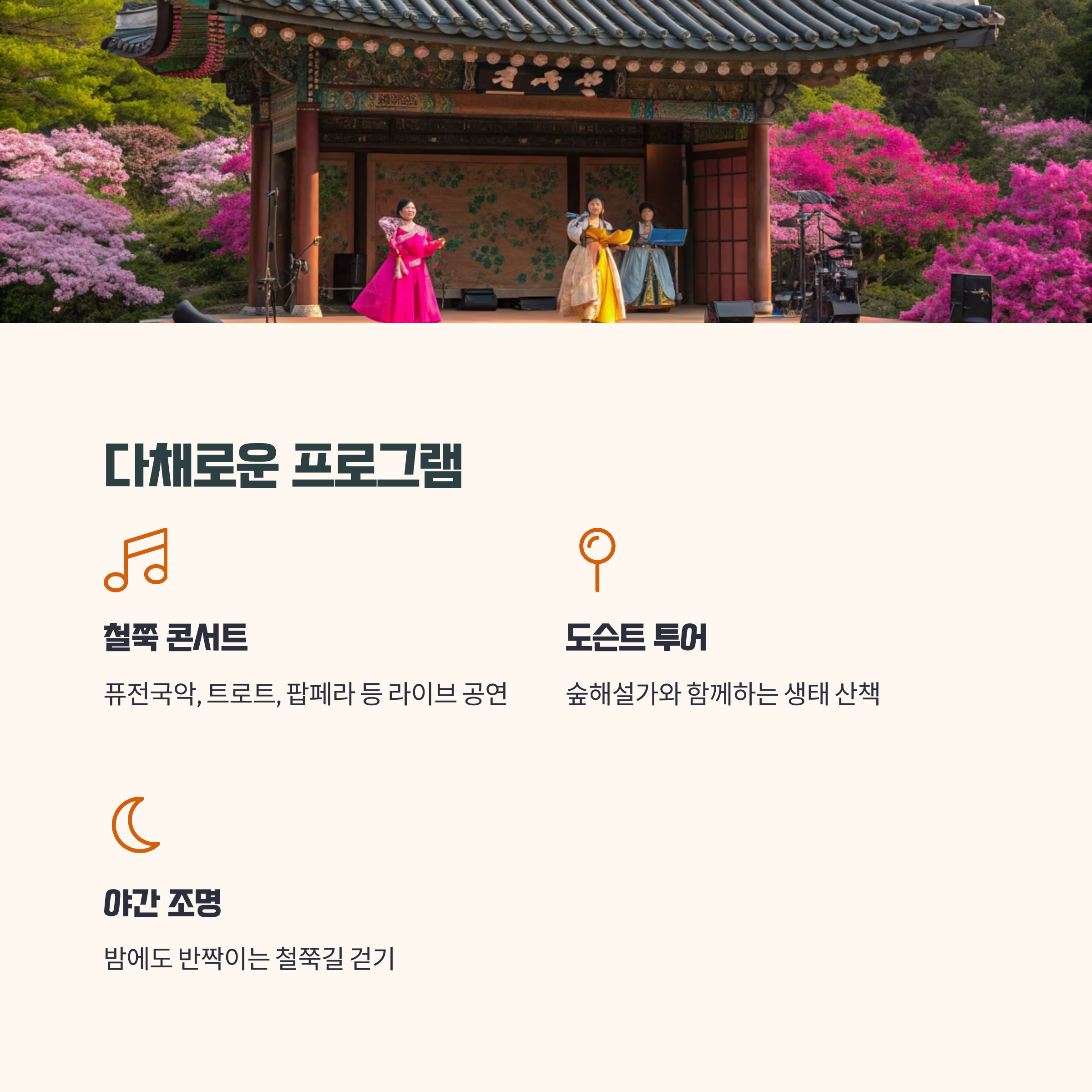 • 철쭉 콘서트: 퓨전국악, 트로트, 팝페라 등 라이브 공연