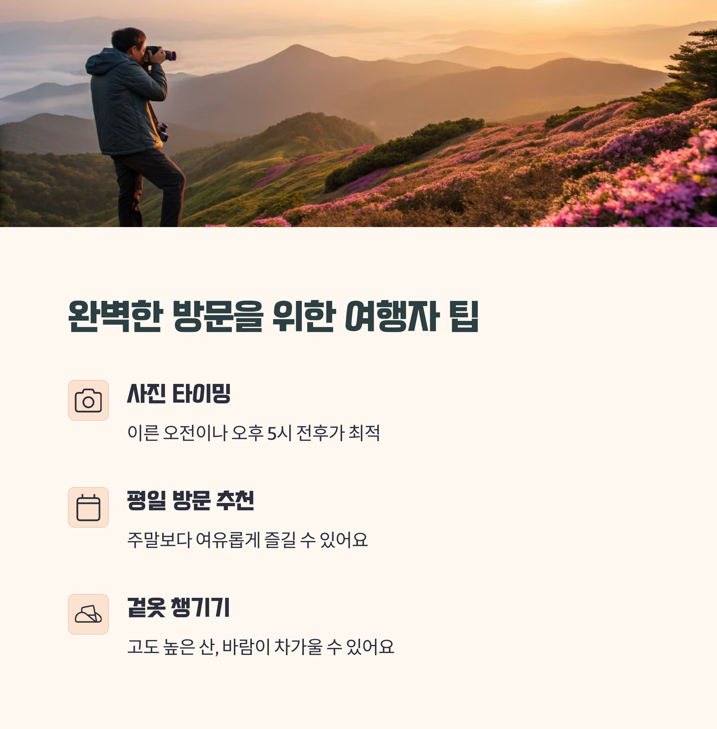 축제를 더욱 즐겁게 즐기기 위한 몇 가지 꿀팁! 황매산 철쭉제를 제대로 만끽하려면 타이밍과 준비가 핵심이에요.