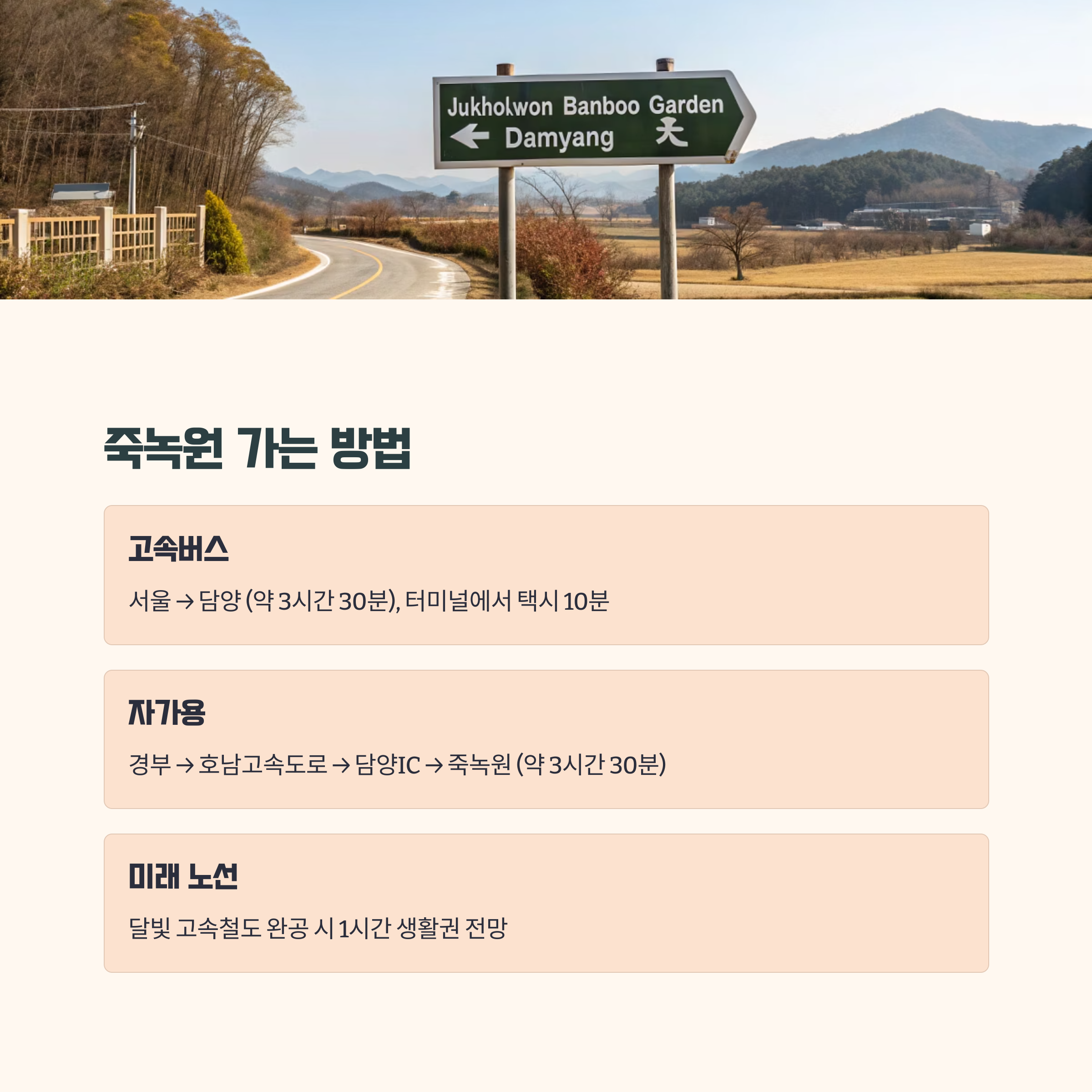 | 고속버스 | 서울 → 담양 (약 3시간 30분), 터미널 도착 후 택시 약 10분 |