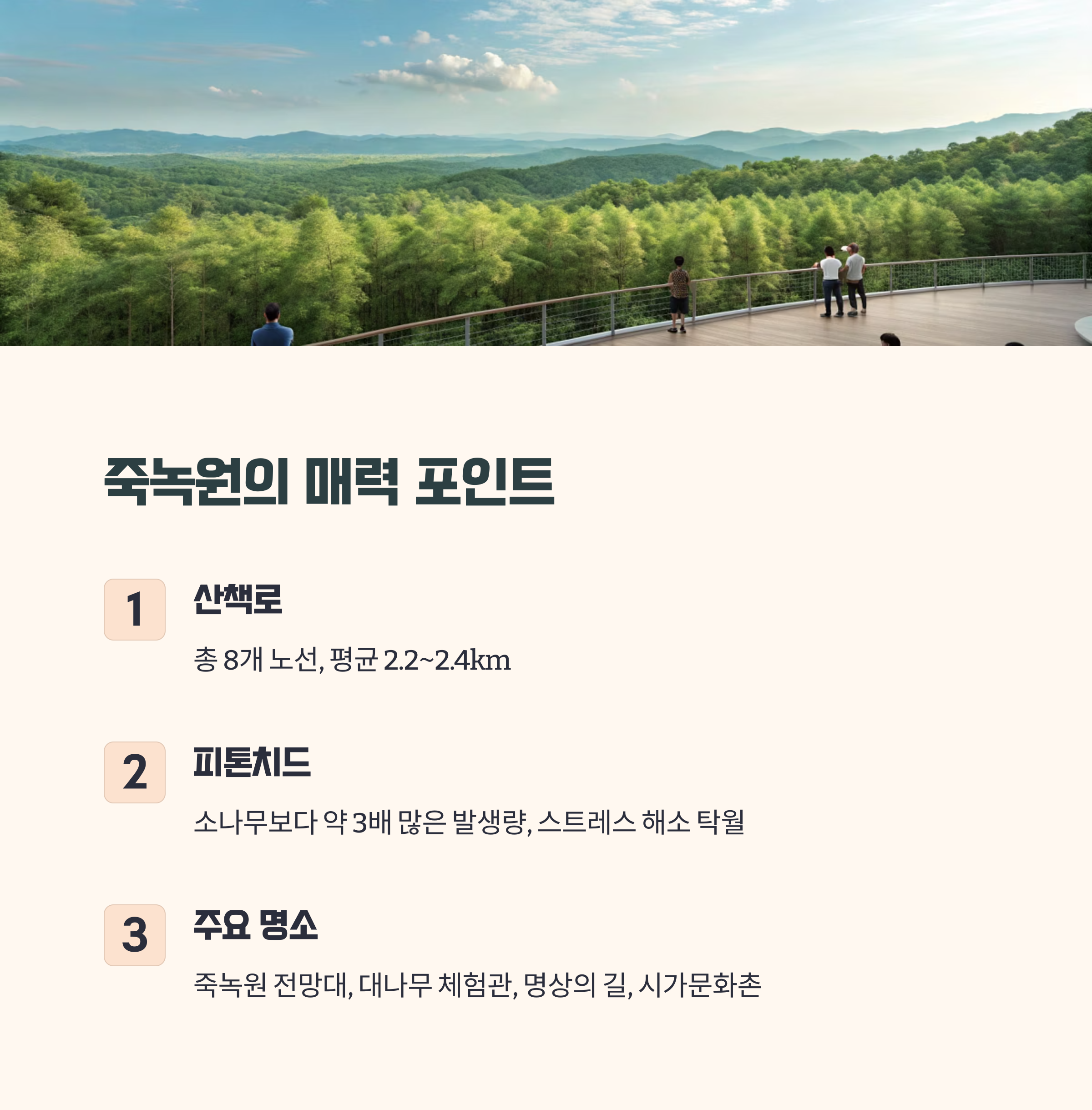 - 죽림욕: 피톤치드 가득한 대나무 숲에서 심신 안정