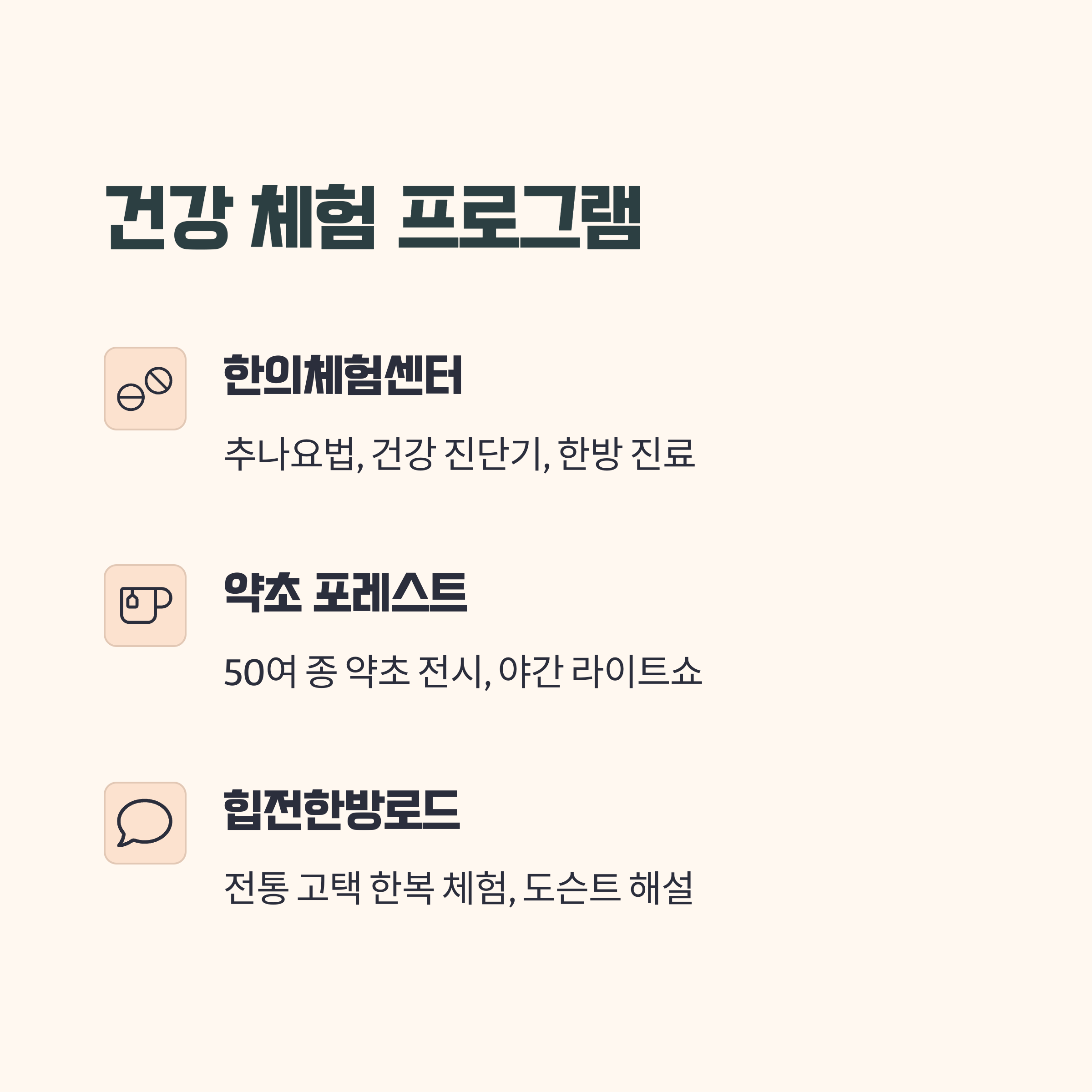 - 한의체험센터: 추나요법, 건강 진단기, 간단한 한방 진료 등 전문가와 함께하는 실전 건강 점검