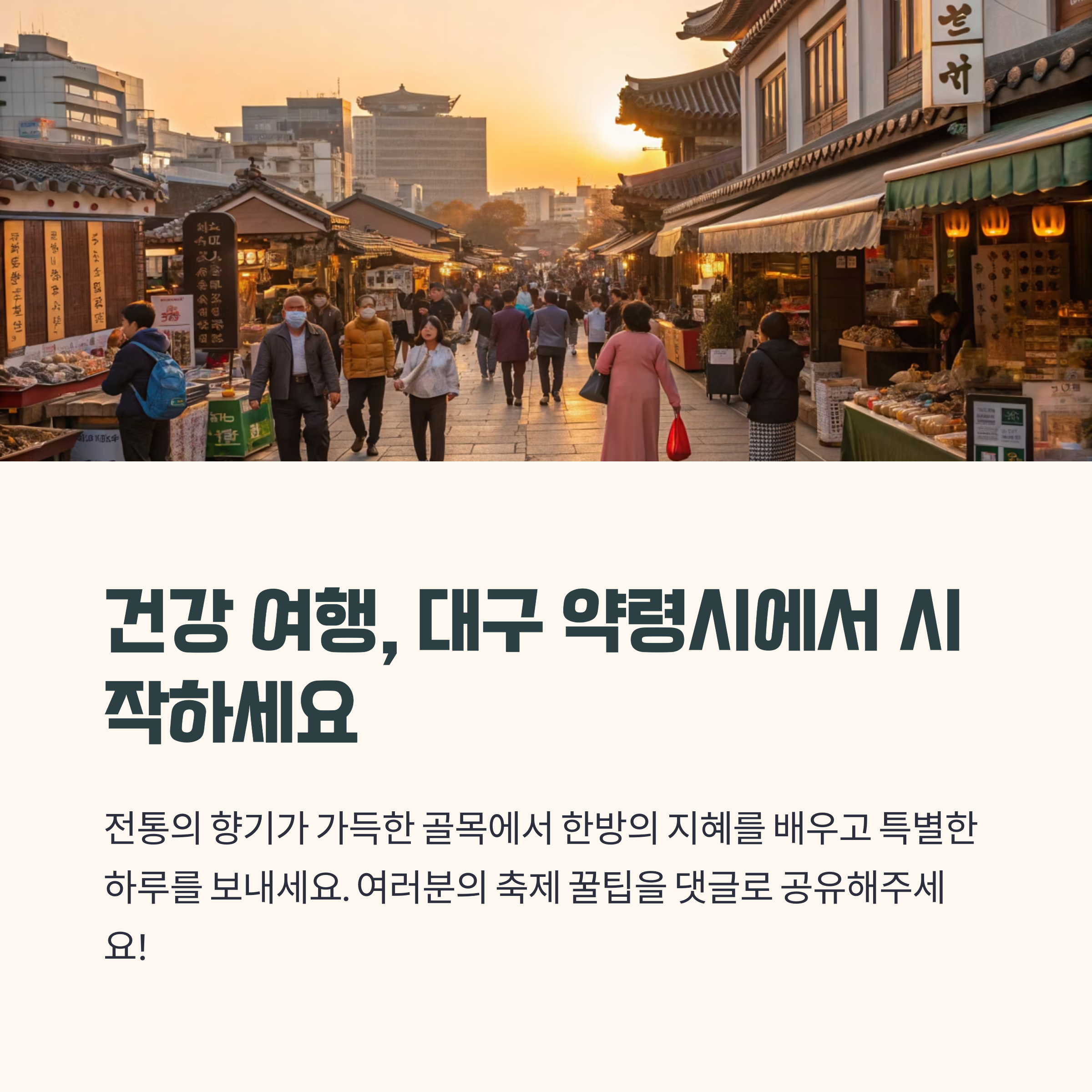 몸도 마음도 힐링되는 여행을 원하신다면, 올해 봄엔 대구 약령시로 떠나보세요. 전통의 향기가 가득한 골목에서 한방의 지혜를 배우고, 색다른 체험과 맛있는 한방 음식을 즐기며 특별한 하루를 보내실 수 있습니다. 소개해드린 프로그램과 맛집, 실용 정보를 참고하셔서 더 알차고 즐거운 축제를 경험하시길 바랍니다. 여러분의 건강 여행, 대구 약령시에서 시작해보세요! 축제에 대한 질문이나 꿀팁이 있다면 댓글로 공유해주세요.
