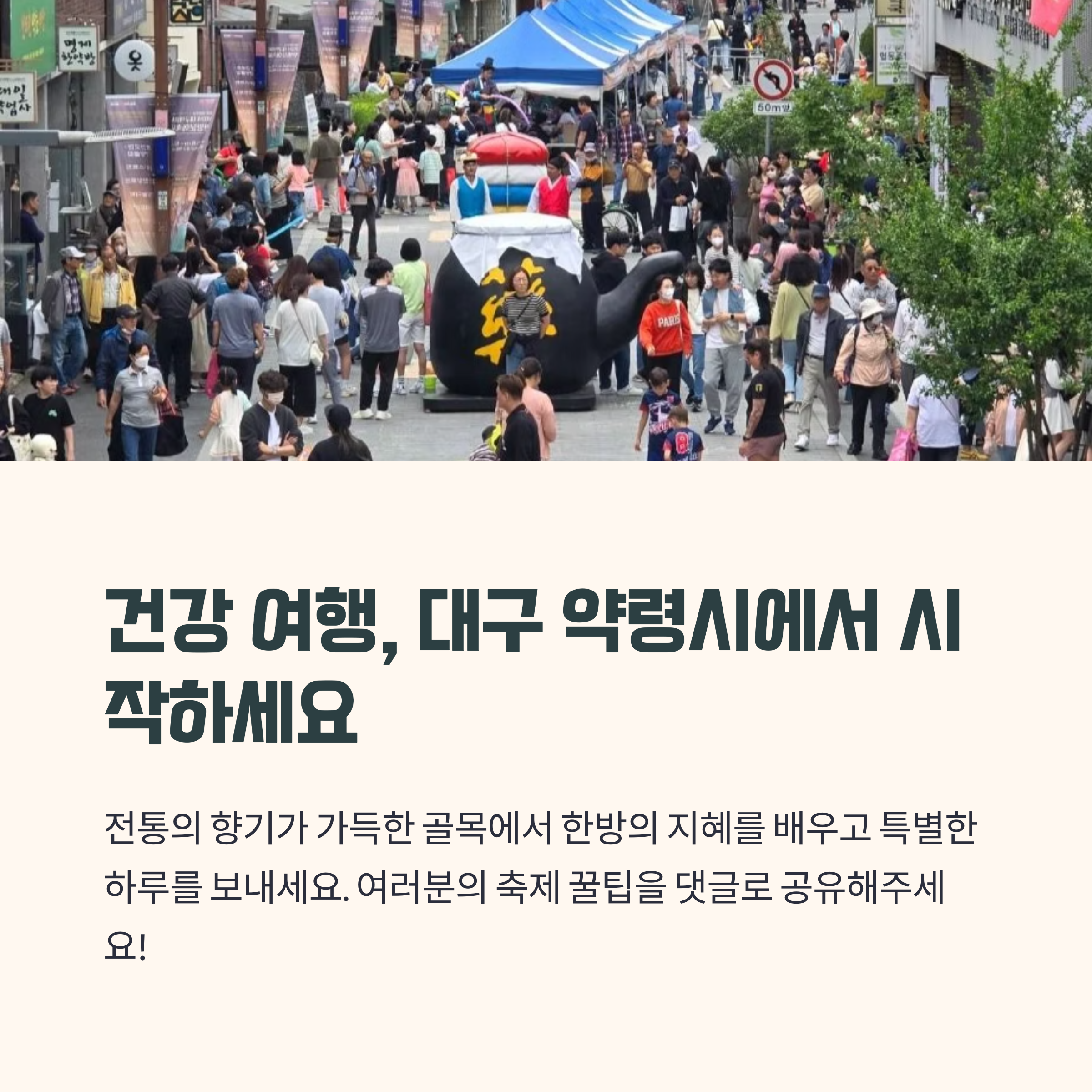 몸도 마음도 힐링되는 여행을 원하신다면, 올해 봄엔 대구 약령시로 떠나보세요. 전통의 향기가 가득한 골목에서 한방의 지혜를 배우고, 색다른 체험과 맛있는 한방 음식을 즐기며 특별한 하루를 보내실 수 있습니다. 소개해드린 프로그램과 맛집, 실용 정보를 참고하셔서 더 알차고 즐거운 축제를 경험하시길 바랍니다. 여러분의 건강 여행, 대구 약령시에서 시작해보세요! 축제에 대한 질문이나 꿀팁이 있다면 댓글로 공유해주세요.