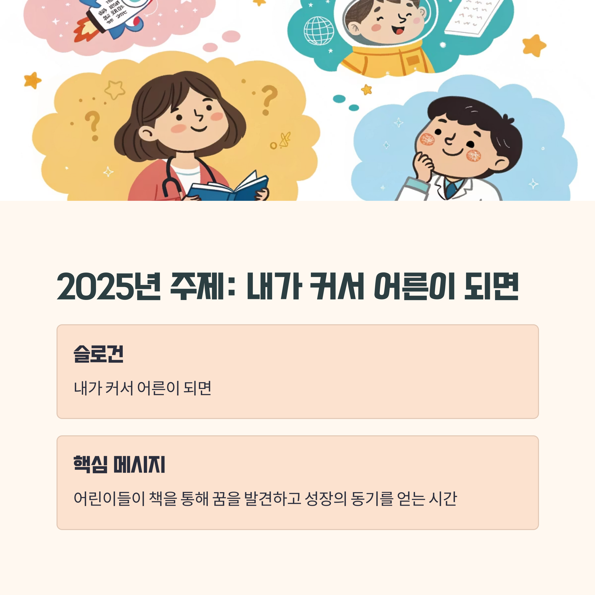 | 핵심 메시지 | 어린이들이 책을 통해 꿈을 발견하고 성장의 동기를 얻는 시간 |