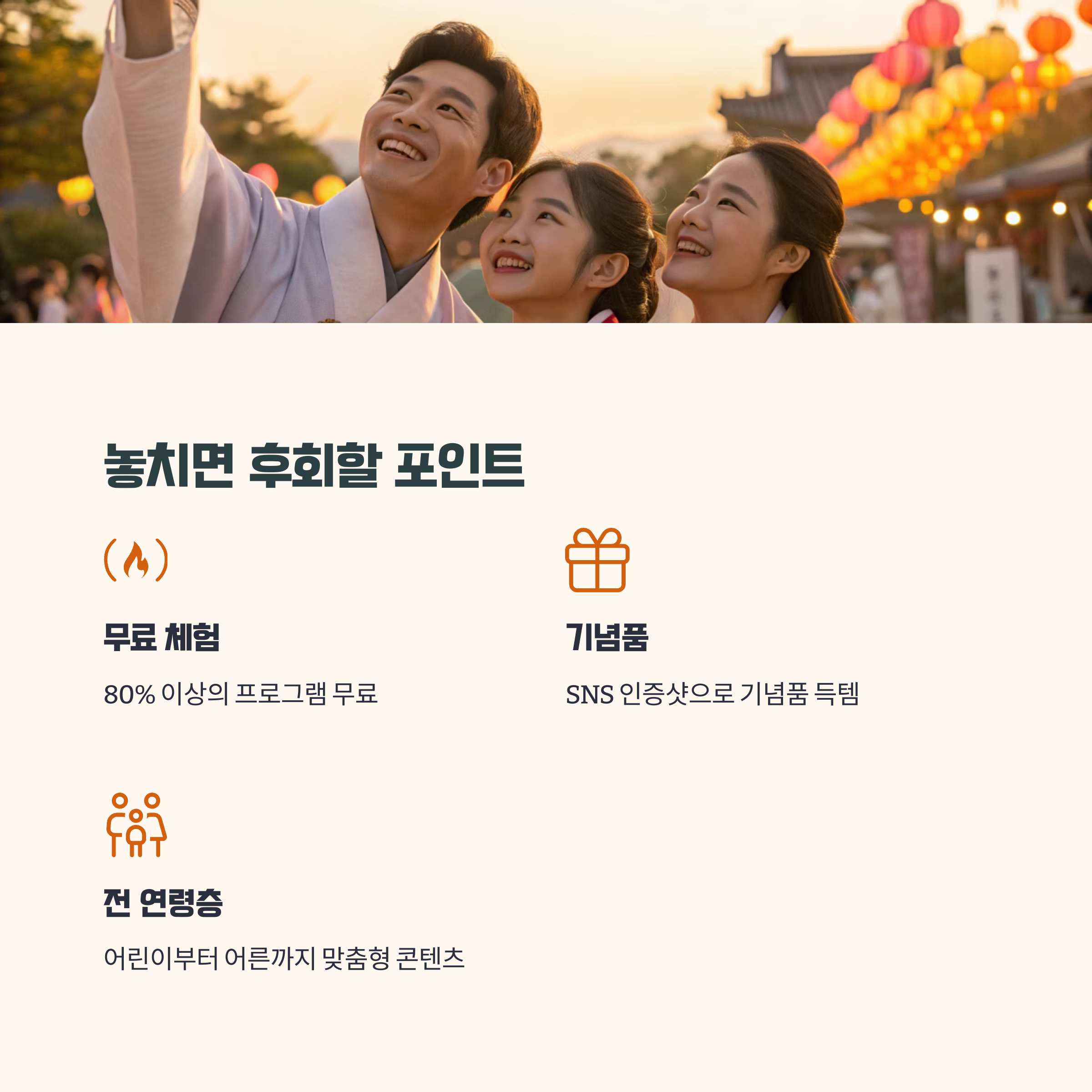 가족 단위로 오신다면 어린이 체험존, 전통놀이, 한복체험 같은 프로그램이 특히 추천되고, 밤에는 유등 퍼레이드와 야시장 분위기를 즐길 수 있어서 커플이나 친구끼리도 분위기 있게 보내기 딱 좋습니다.