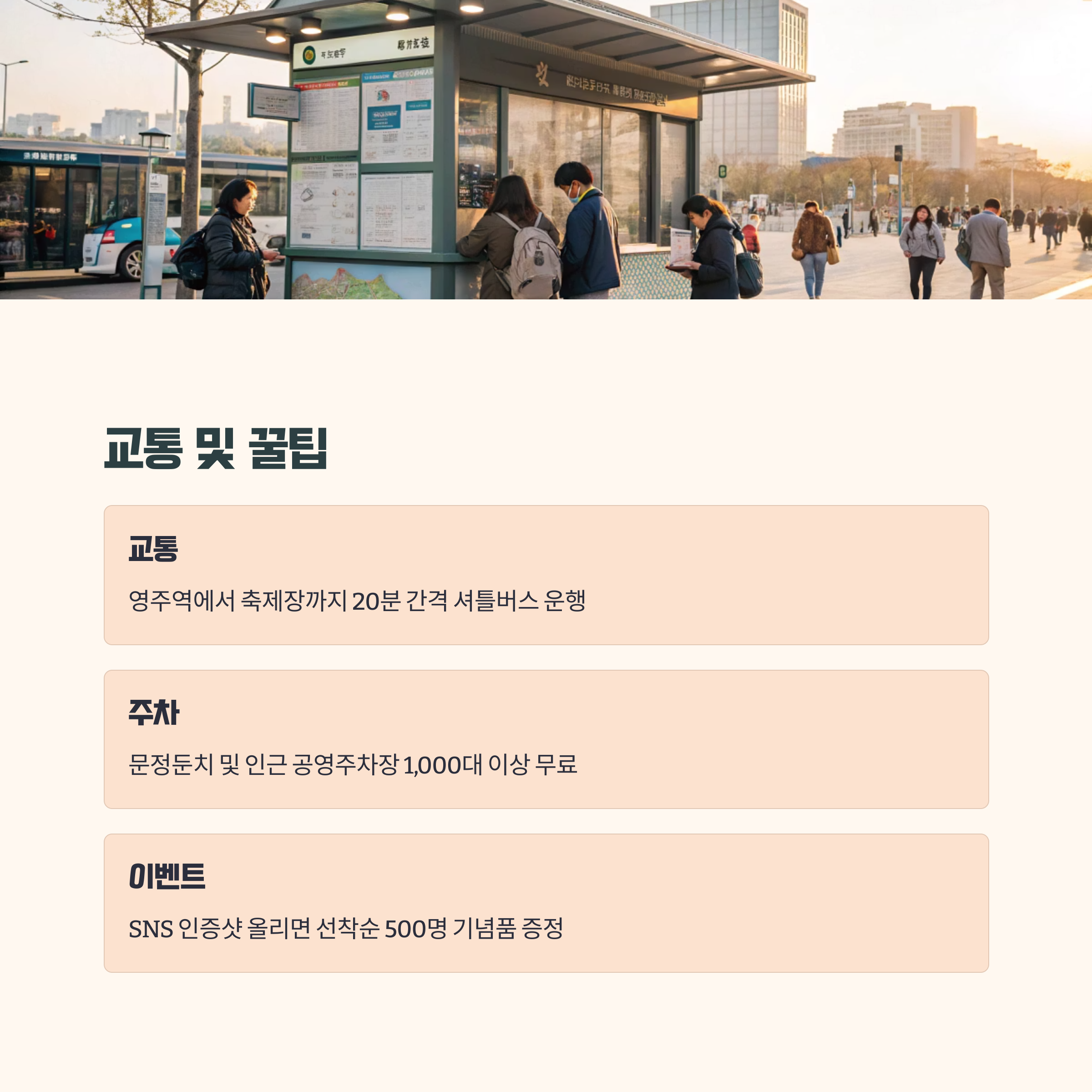 축제 기간 동안 영주는 관광객들로 북적이니 미리 교통편과 주차 정보를 알아두면 좋습니다.