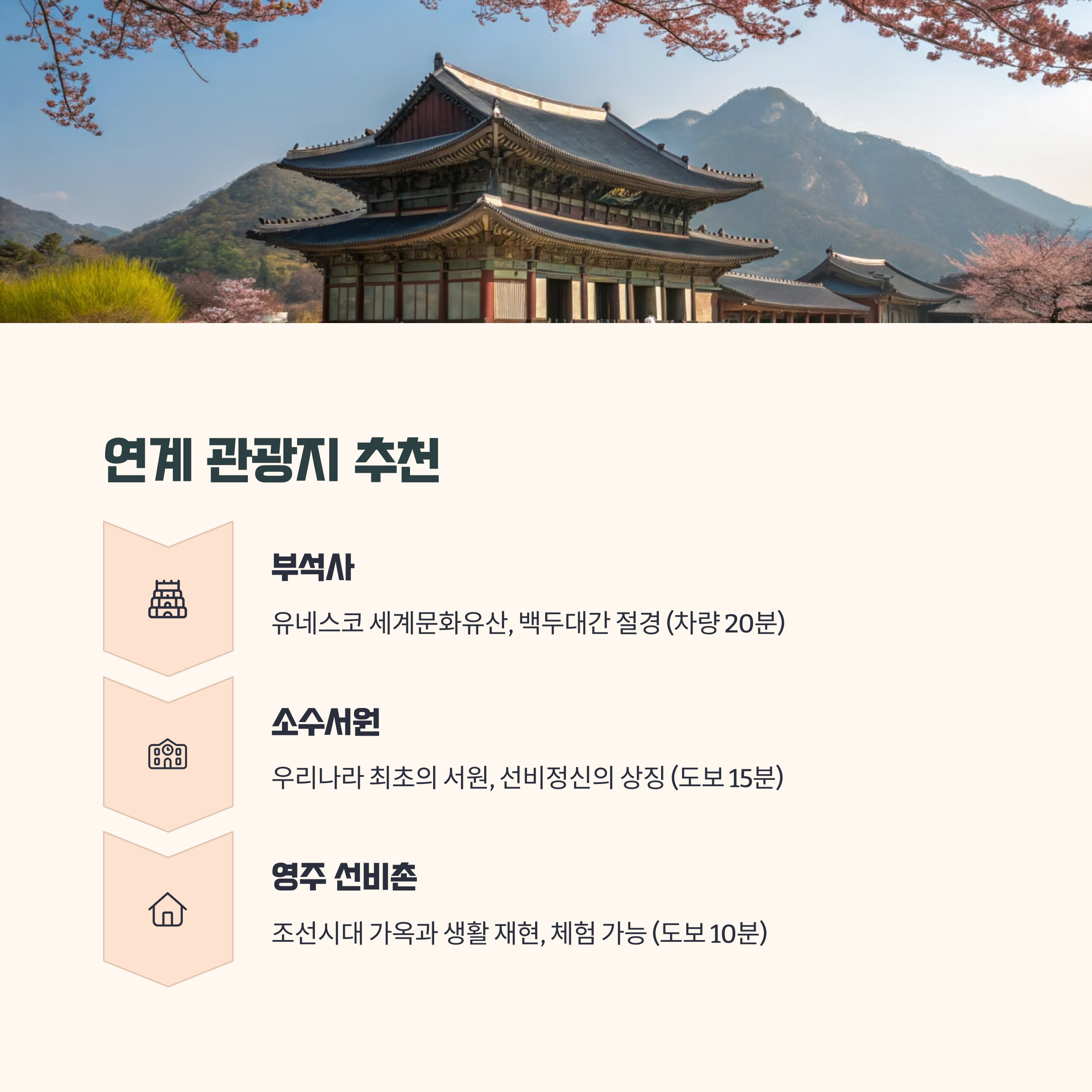 | 부석사 | 유네스코 세계문화유산, 백두대간이 보이는 절경 | 차량 20분 |