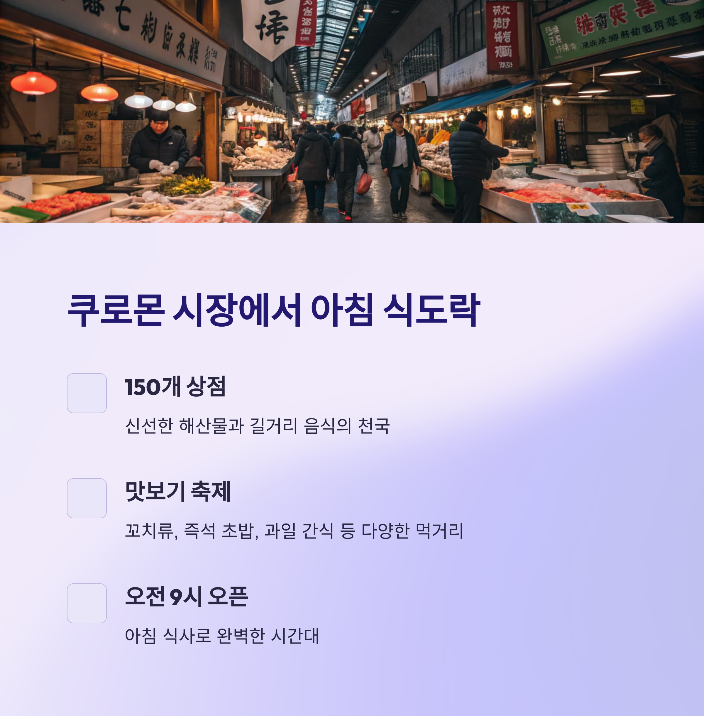 쿠로몬 시장에서 아침 식도락 시작
