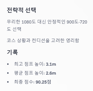 무리하게 1080도 회전을 고집하기보다는 코스 상황과 자신의 컨디션에 맞춰 전략적으로 기술을 구성하는 영리함을 보여줬습니다.