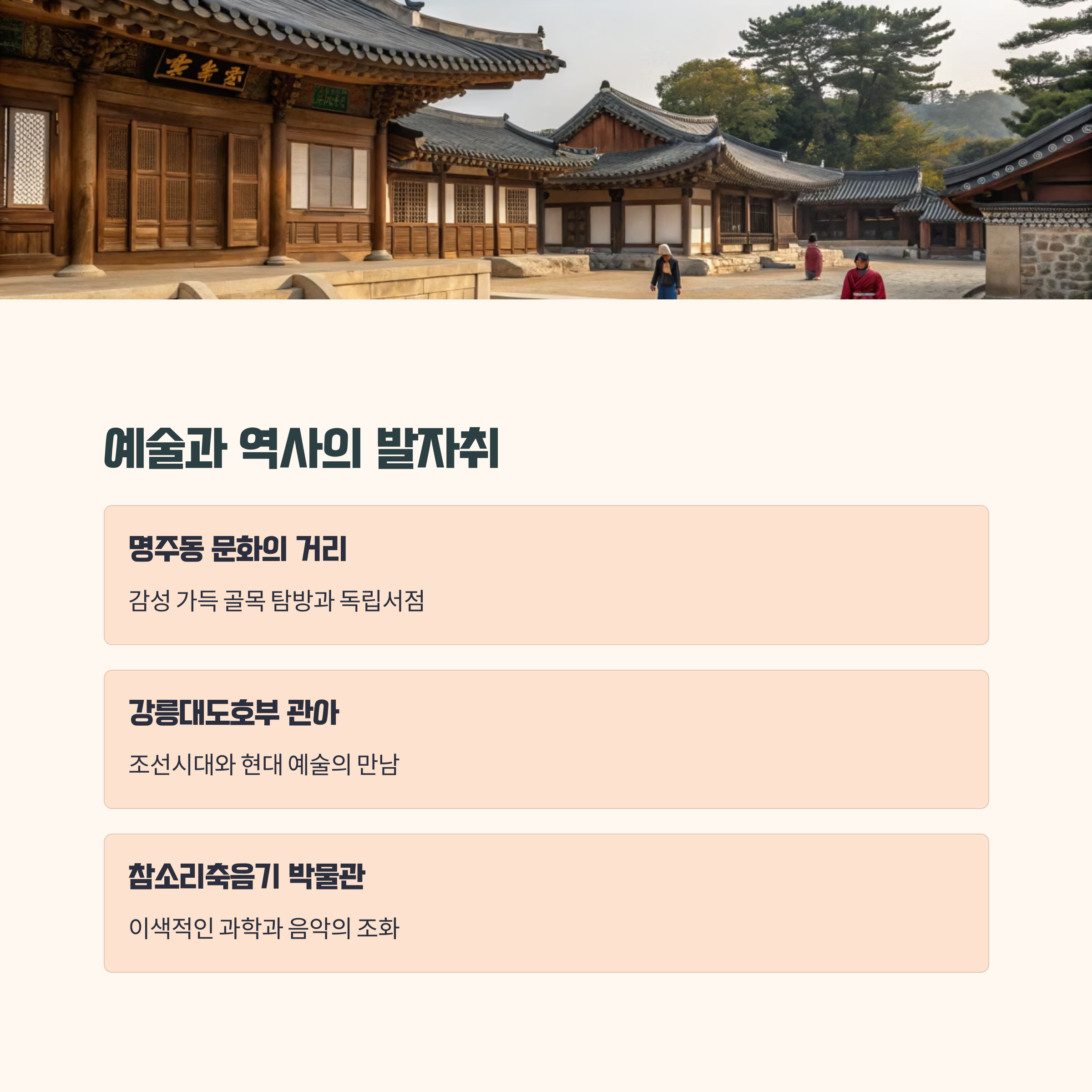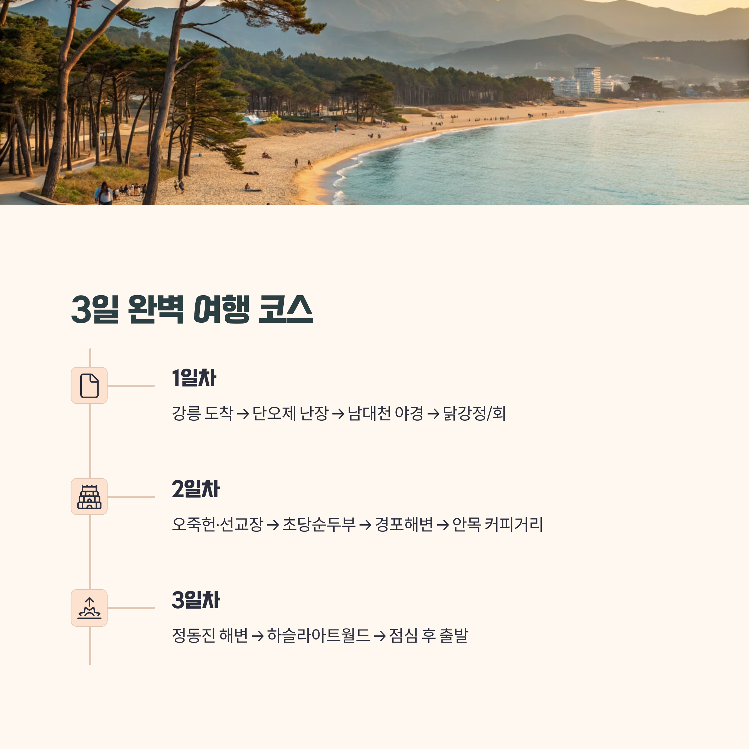 - 2일차: 오죽헌·선교장 탐방 → 초당순두부 점심 → 경포해변 산책 → 안목 커피거리 카페투어