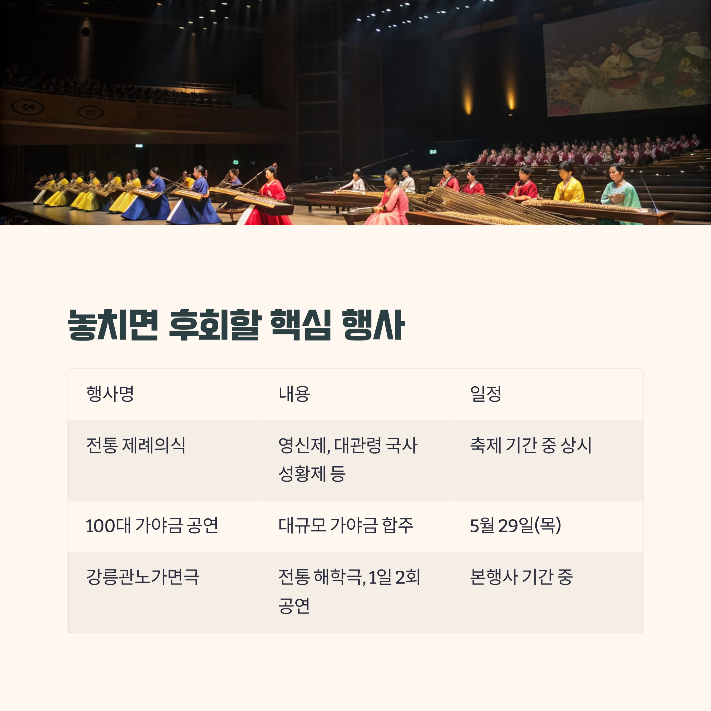 | 100대 가야금 공연 | 전국 연주자들이 펼치는 대규모 가야금 합주 | 5월 29일(목) |