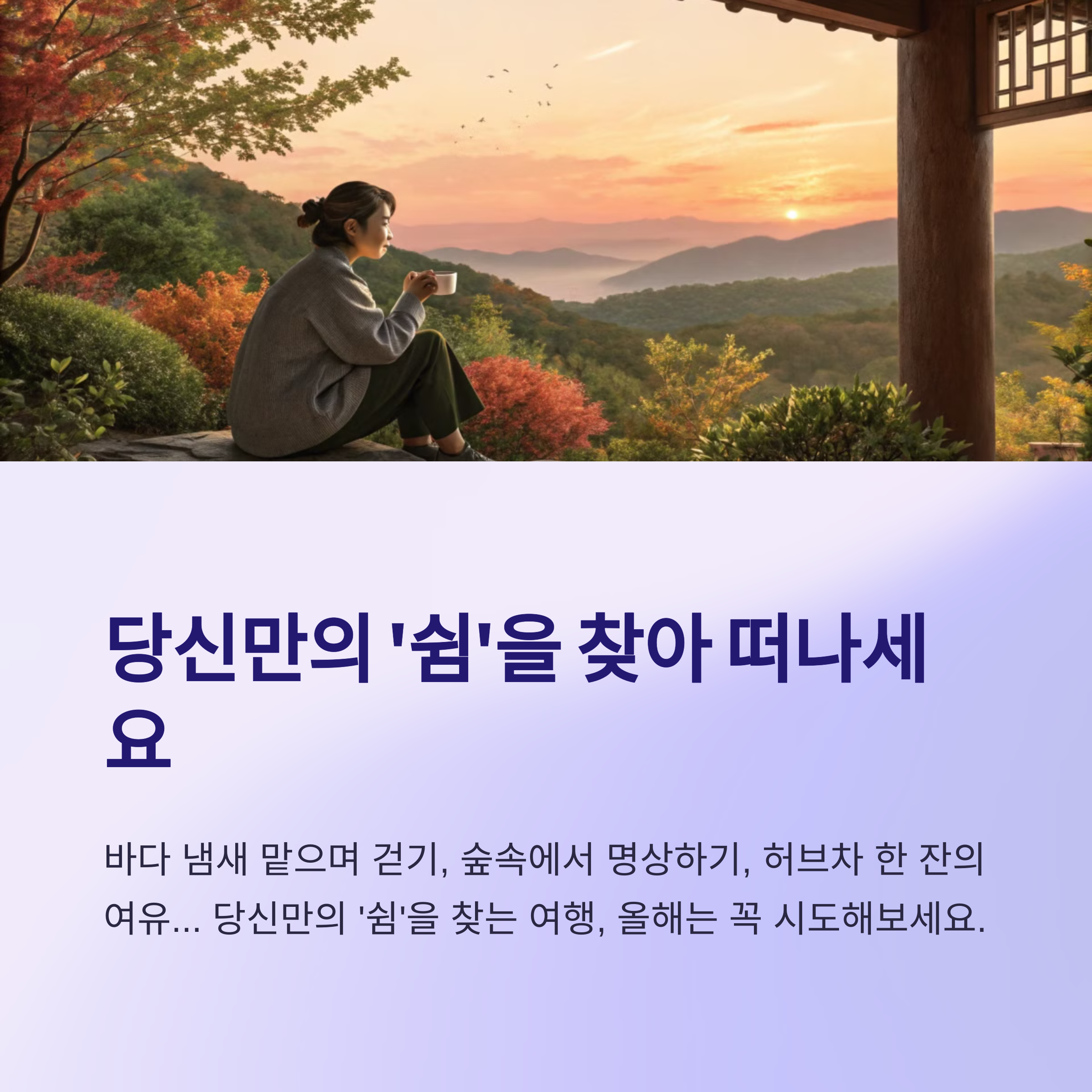 여행이 단순한 '이동'이 아닌, 삶을 재정비하는 '쉼표'가 되어가는 시대. 여러분은 어떤 힐링을 꿈꾸고 계신가요?