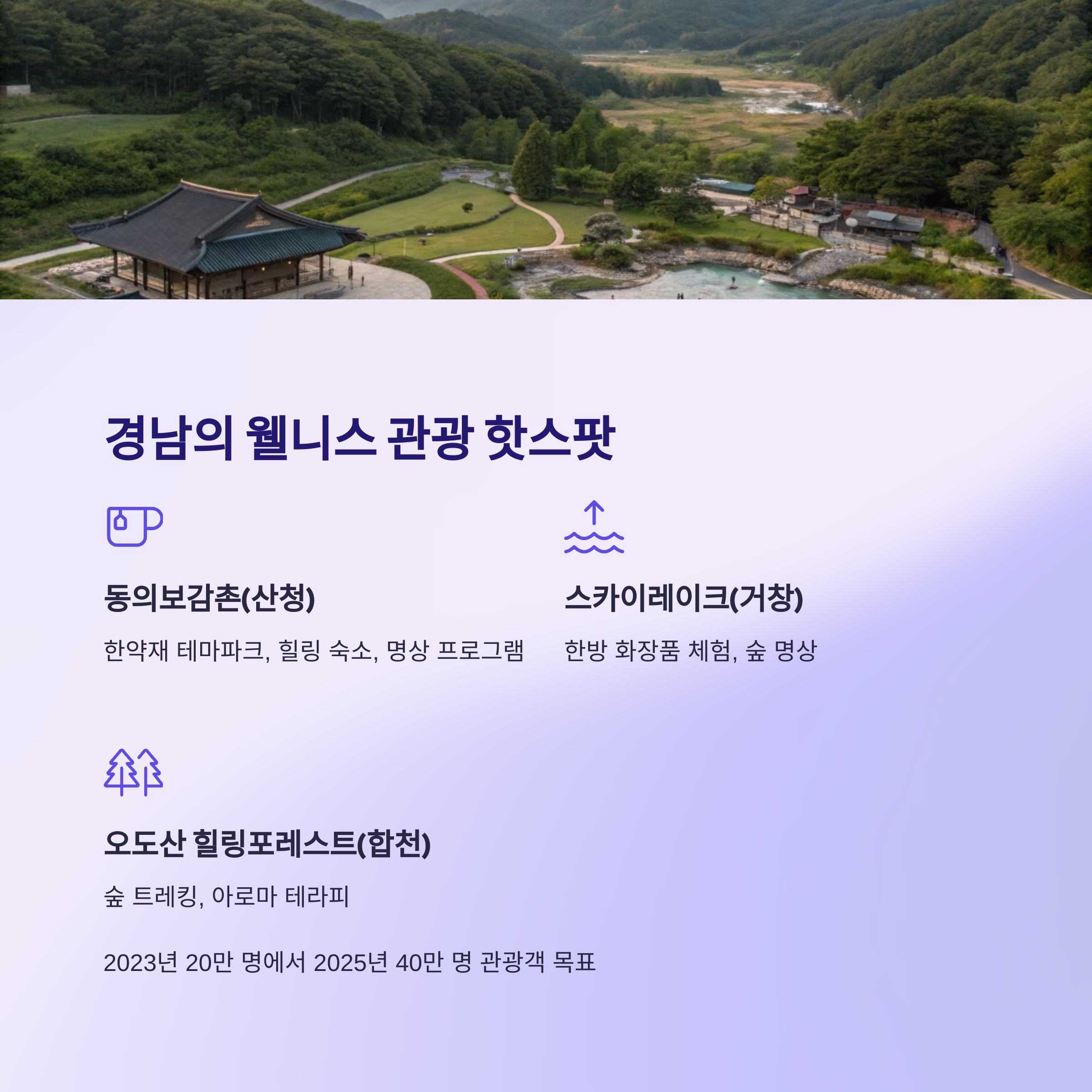 2023년 20만 명이던 관광객이 2025년엔 무려 40만 명으로 목표가 잡혔고, 이를 위해 7개의 웰니스 명소를 집중 육성 중입니다.