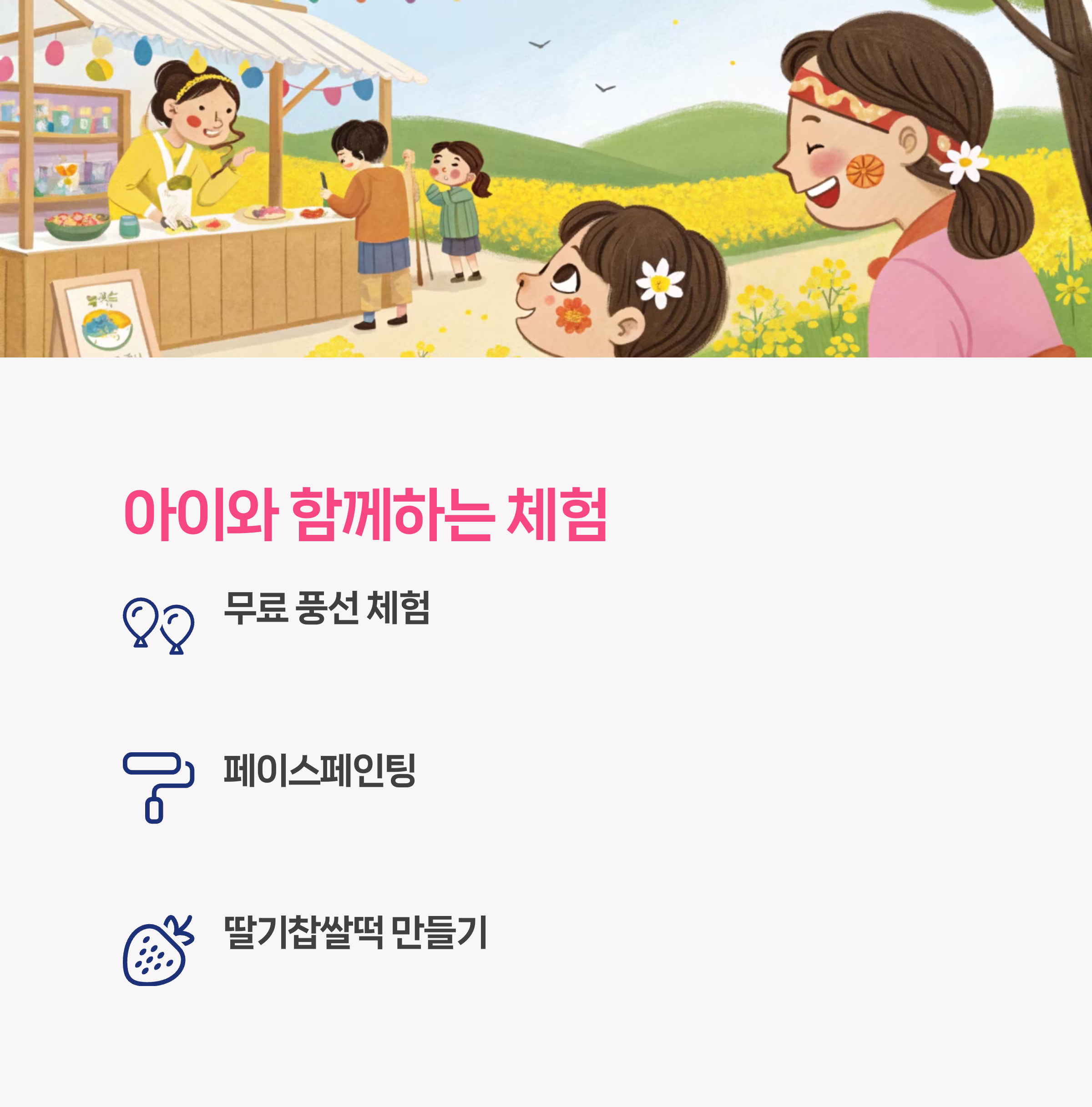 👉 일부는 무료, 일부는 유료입니다! 풍선 체험, 페이스페인팅 등은 무료로 운영되고, 딸기찹쌀떡 만들기 같은 건 재료비 정도 있어요~