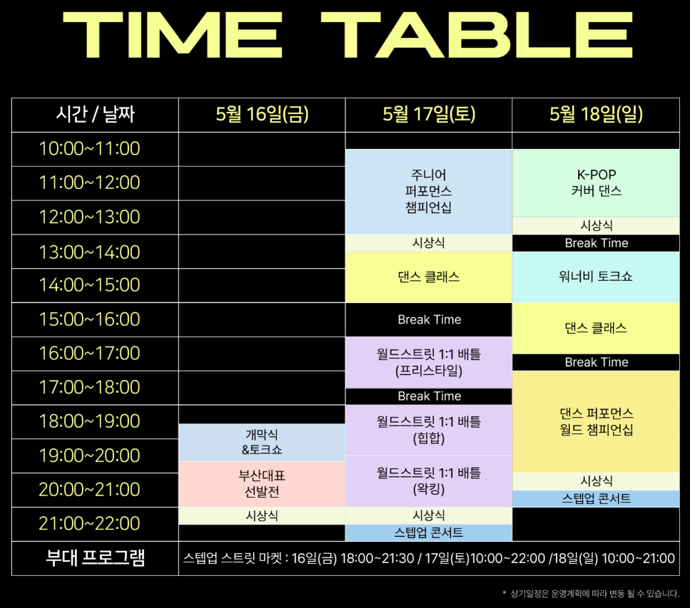 | 메인행사 | 월드 스트릿 1:1 배틀 | 전 세계 댄서들이 참여하는 1:1 스트릿댄스 대결 |