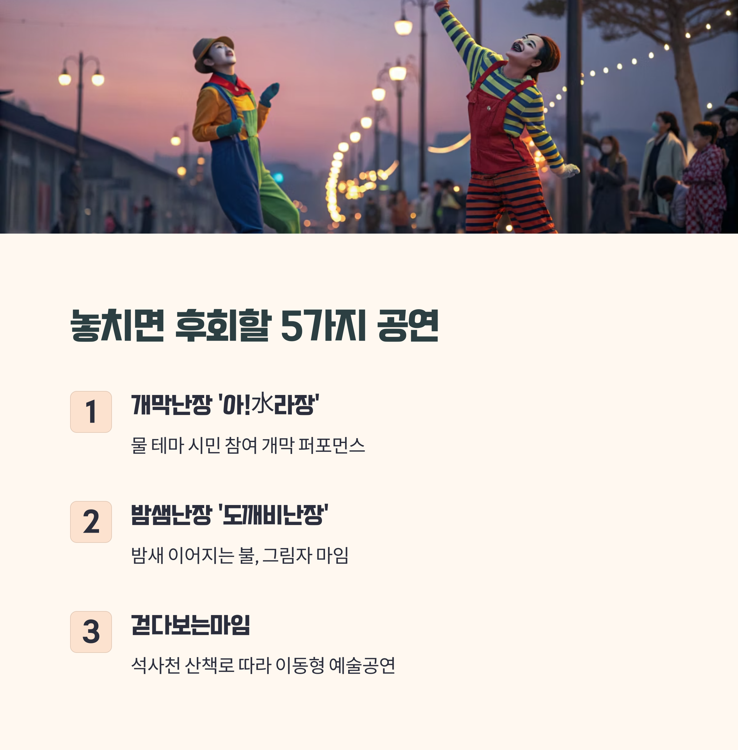 - 놓치지 말아야 할 다섯 가지 공연: ‘아수라장’, ‘도깨비난장’, ‘걷다보는마임’ 등