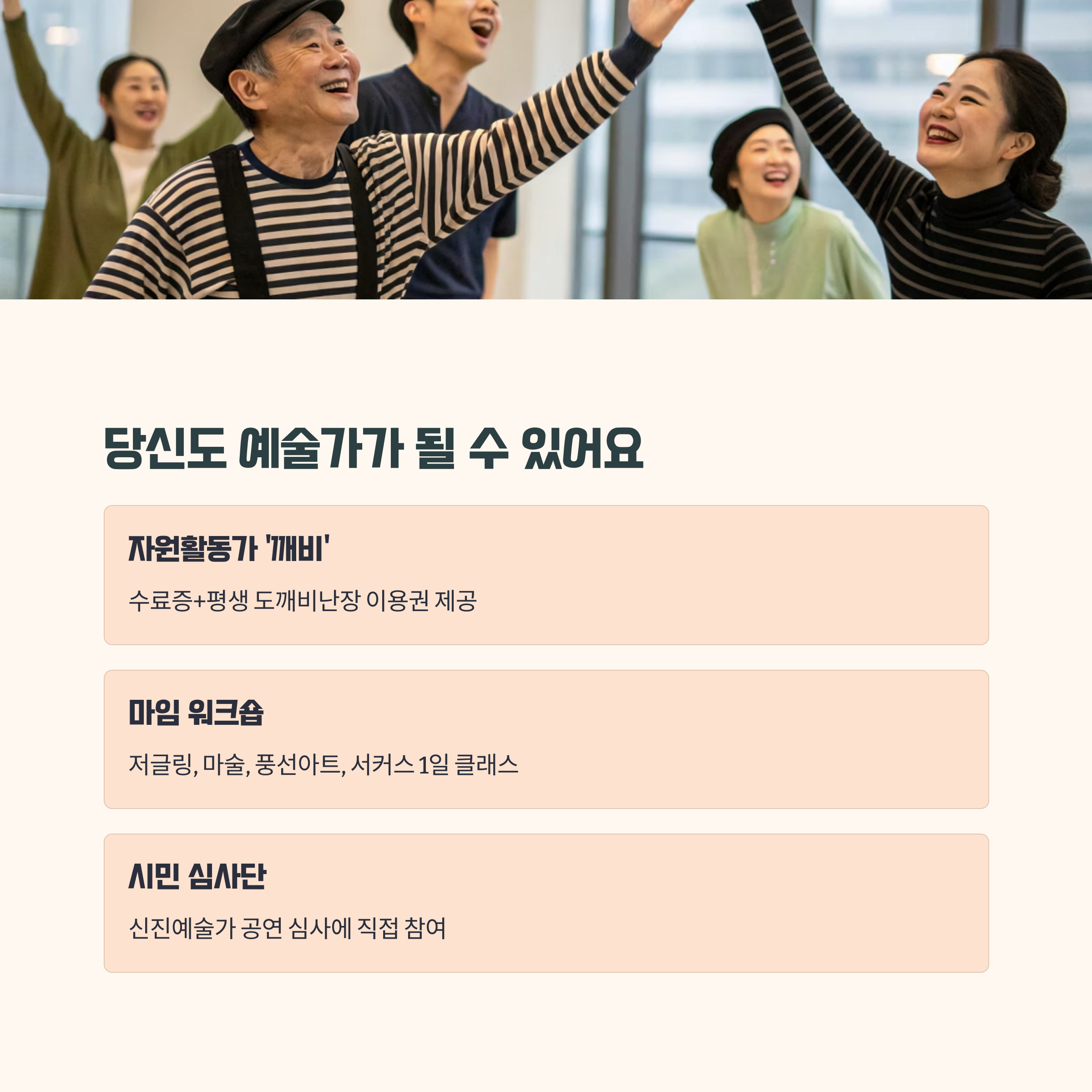 - 시민도 예술가가 되는 참여형 프로그램: 퍼포먼스, 심사단, 자원활동가