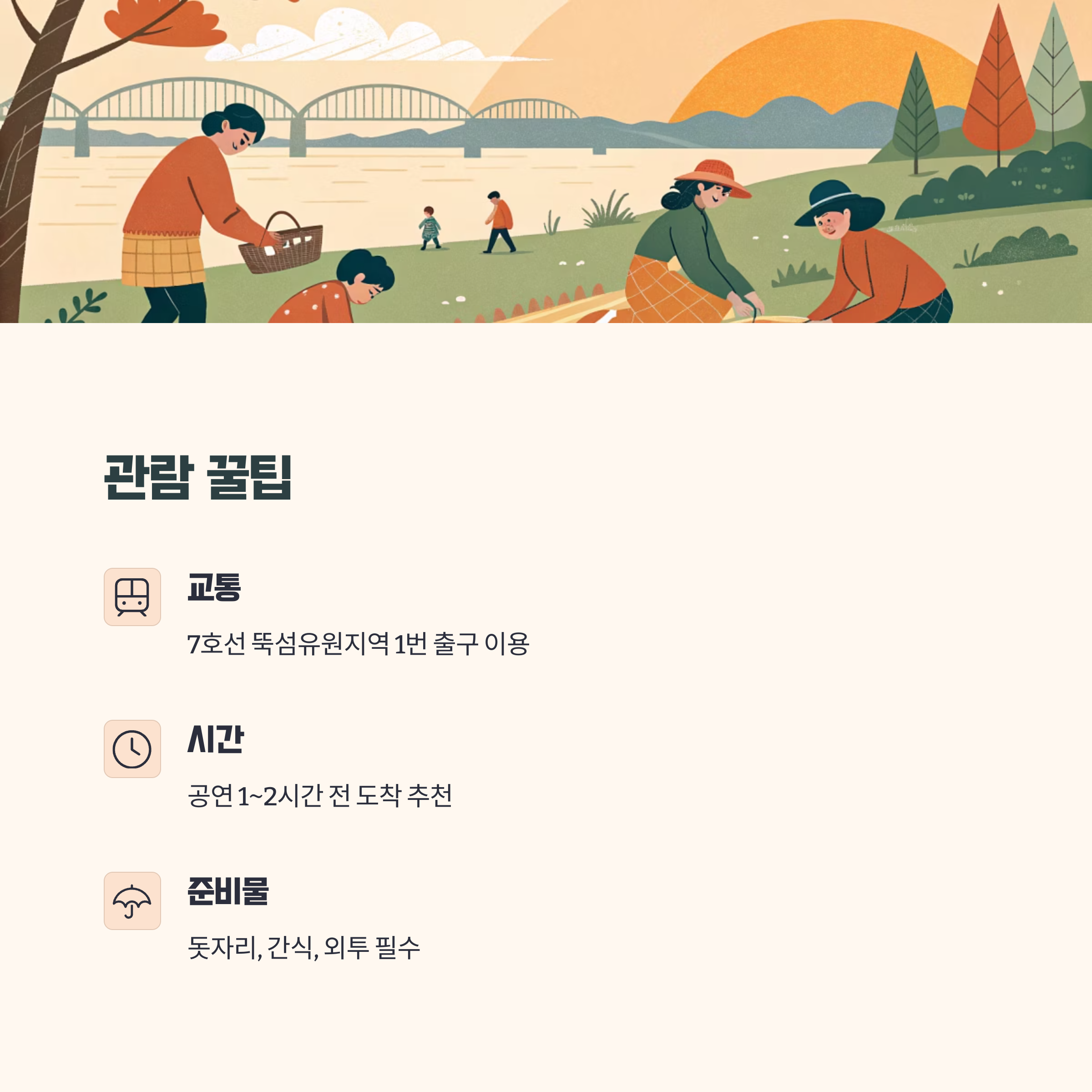 - 돗자리, 간식, 외투(저녁 기온 대비) 준비