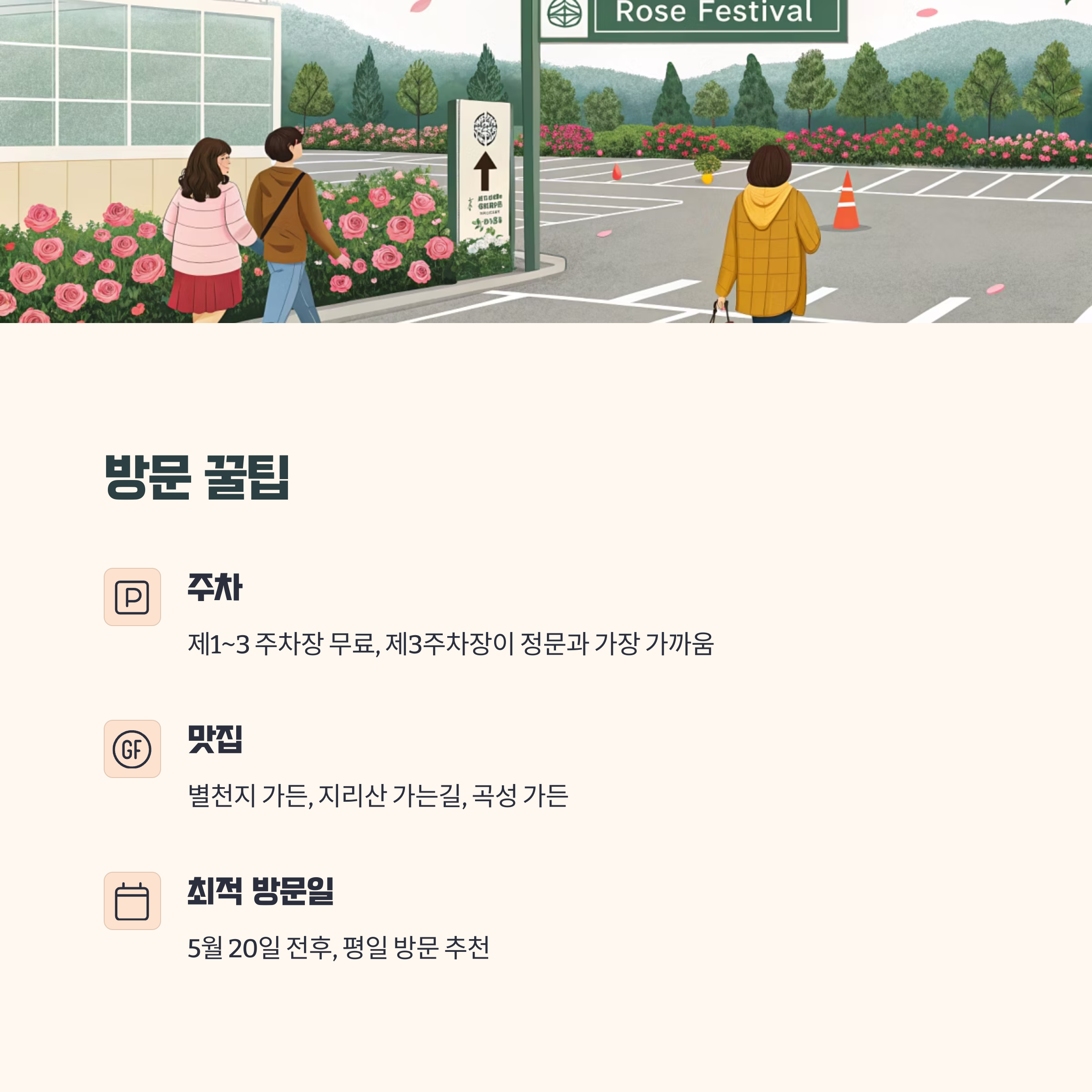 | 최적 방문일 | 5월 20일 전후 (장미 만개 시점), 평일 방문 추천 |