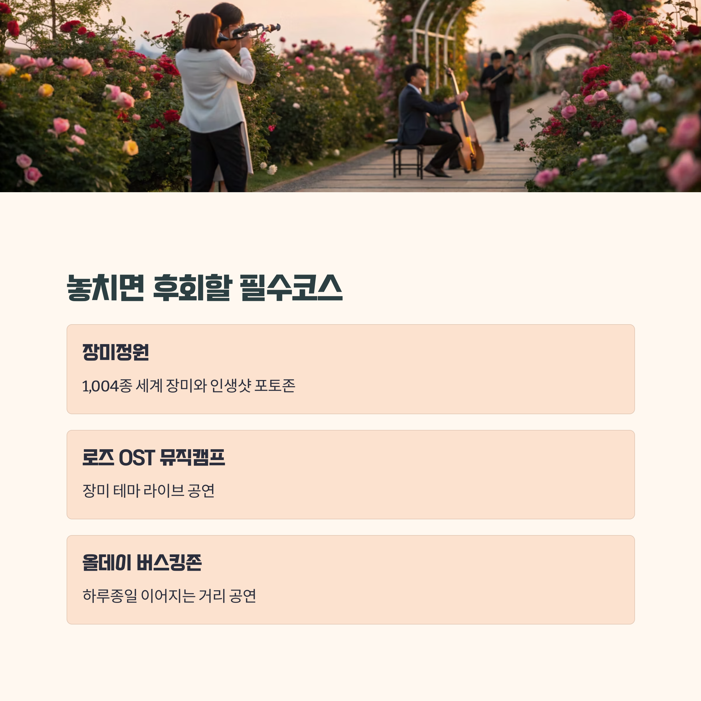 | 장미정원 | 1,004종 세계 장미 + 인생샷 포토존 | 보기 힘든 희귀 품종과 감성적인 사진 스팟 |