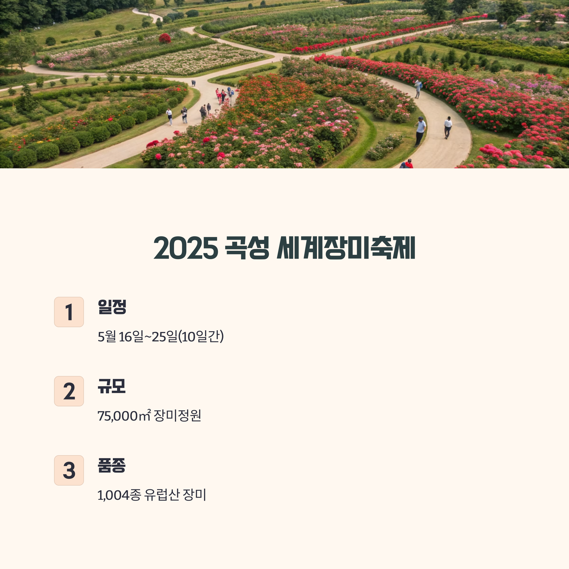 | 최적 방문일 | 5월 20일 전후 (장미 만개 시점), 평일 방문 추천 |