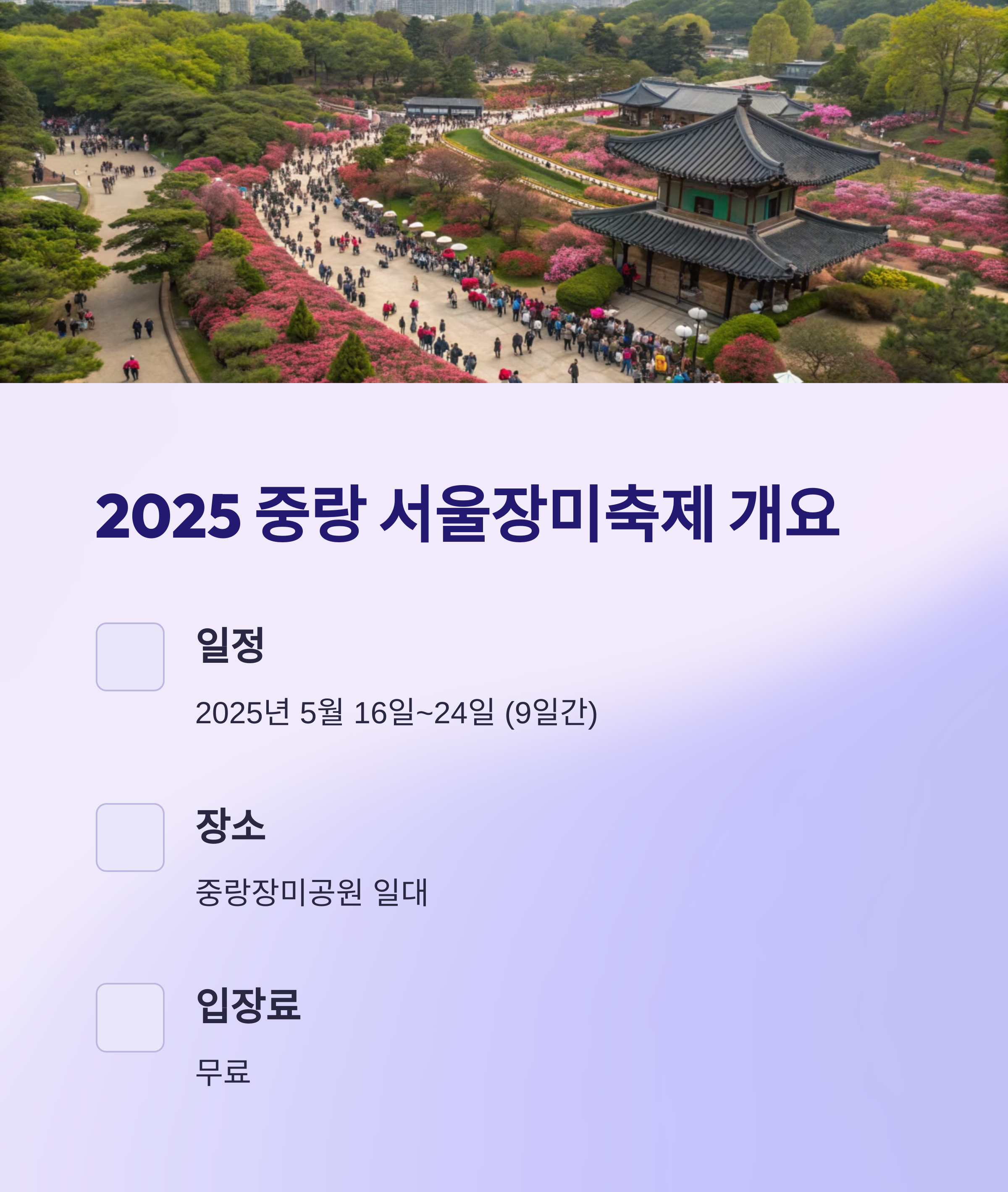 매년 더 풍성해지고 있는 중랑 서울장미축제는 단순한 꽃축제를 넘어, 사람과 자연, 문화가 함께 어우러지는 진짜 '봄의 정원'이에요.
