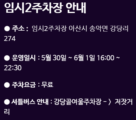 | 셔틀버스 | 주차장 ↔ 행사장 간, 무료 운행 |