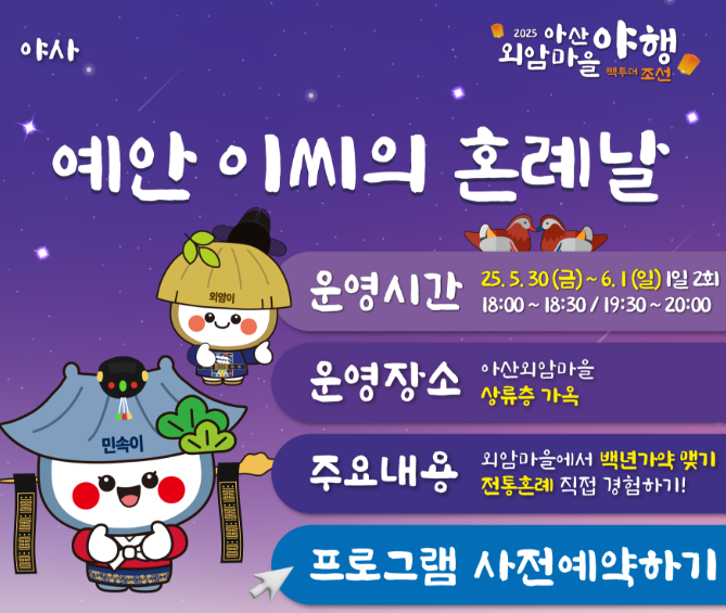 2025 아산 외암마을 야행은 오는 5월 30일(금)부터 6월 1일(일)까지 3일간 열리는 야간 문화 축제로,