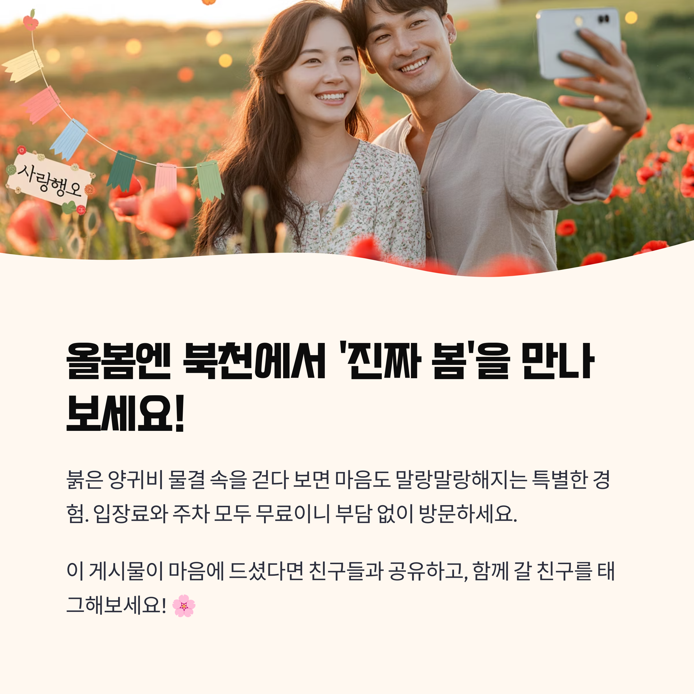 하동 북천 꽃양귀비 축제는 단순한 꽃 구경을 넘어서, 지역과 계절을 오롯이 느낄 수 있는 소중한 시간입니다. 붉은 양귀비 물결 속을 걷다 보면 어느새 마음도 말랑말랑해지는 걸 느끼게 될 거예요. 입장료와 주차 모두 무료이니 부담 없이 가볍게 다녀올 수 있고요, SNS 인증샷부터 가족 나들이까지 모두 만족할 수 있는 구성이라 누구에게나 추천할 수 있는 봄 축제입니다. 여러분도 올봄엔 북천에서 '진짜 봄'을 만나보세요!