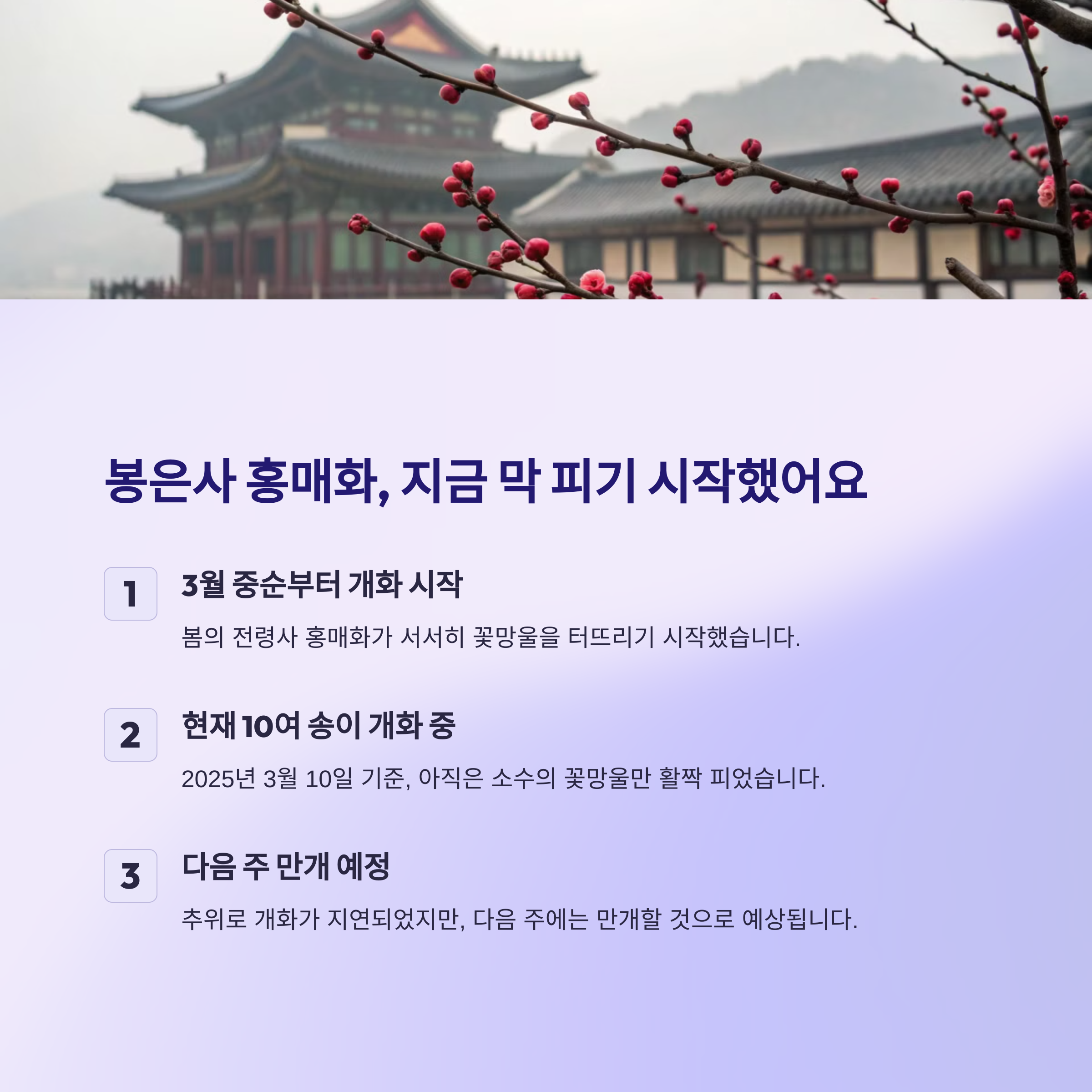 자, 가장 중요한 실시간 개화 상태부터 체크해봅시다! 🌸 2025년 3월 10일 기준으로, 봉은사 홍매화는 약 10여 송이가 개화를 시작했어요.