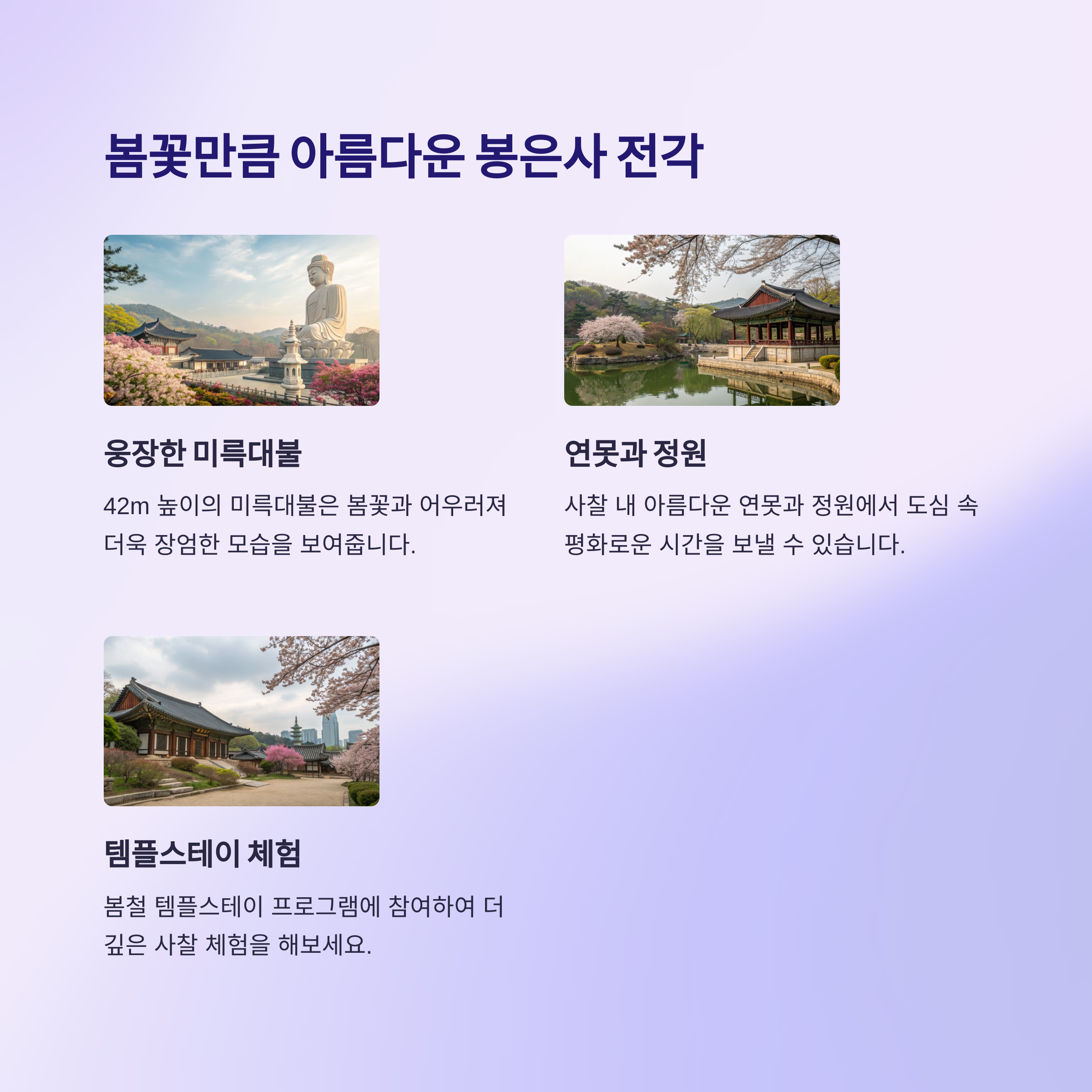 특히 봉은사는 도심 한복판에 있어서 멀리 가지 않아도 아름다운 봄 풍경을 즐길 수 있는 게 최고 장점이에요.