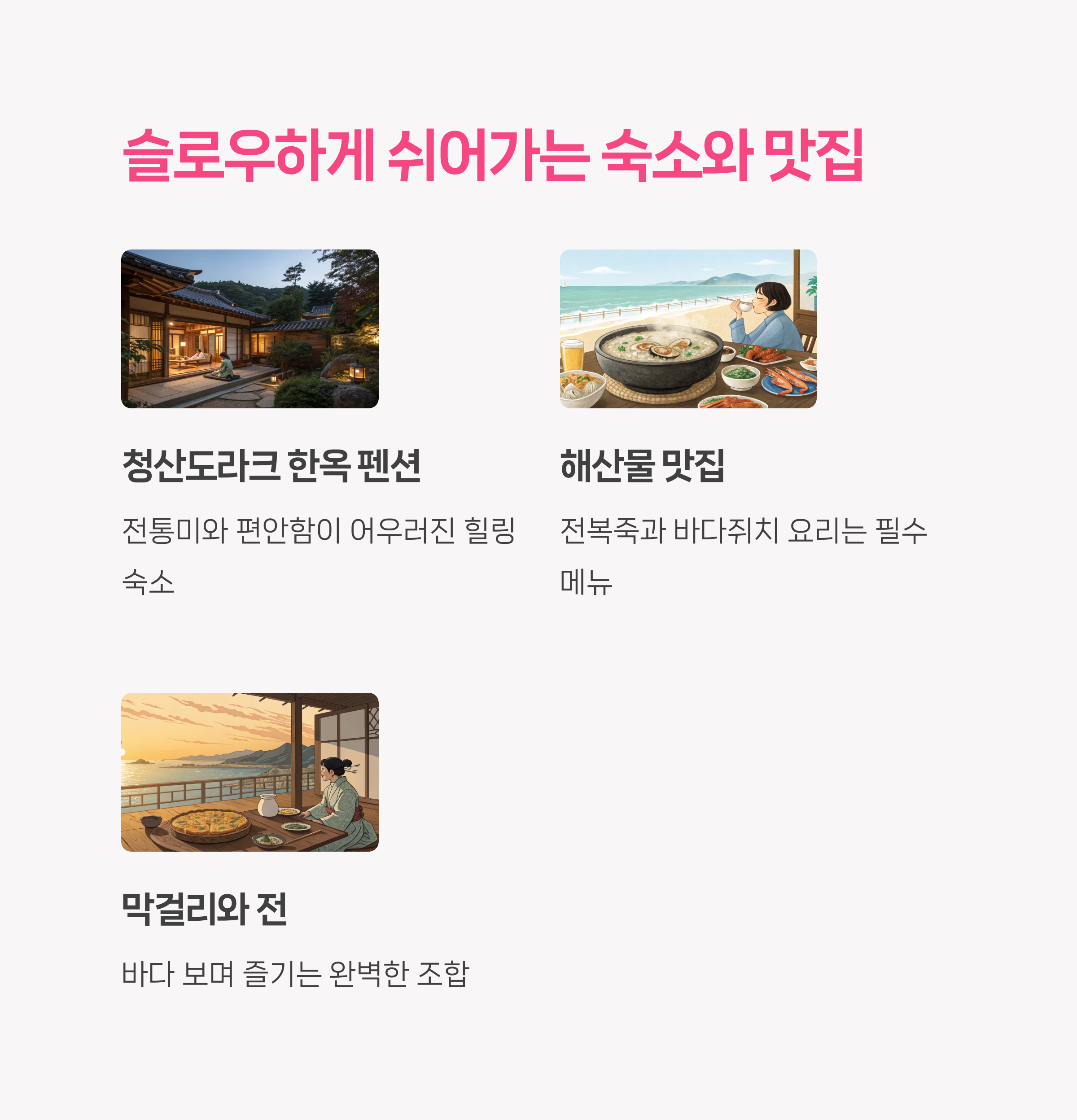 특히 ‘청산도라크 한옥 펜션’은 전통미와 편안함이 딱 어우러진 힐링 장소~
