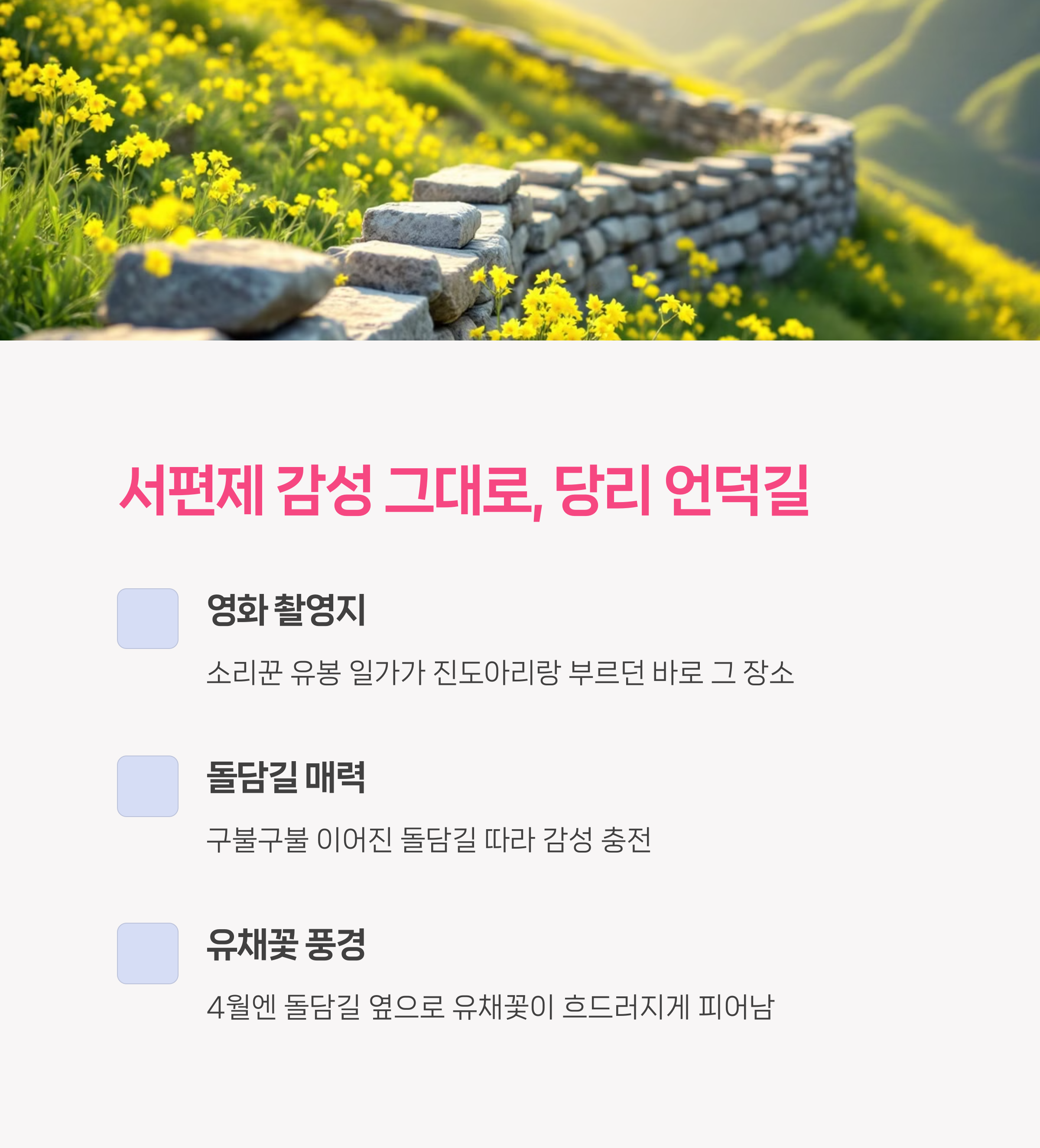 특히 4월엔 이 돌담길 옆으로 유채꽃이 흐드러지게 피어나서, 완전 영화 속 주인공이 된 느낌 든답니다!